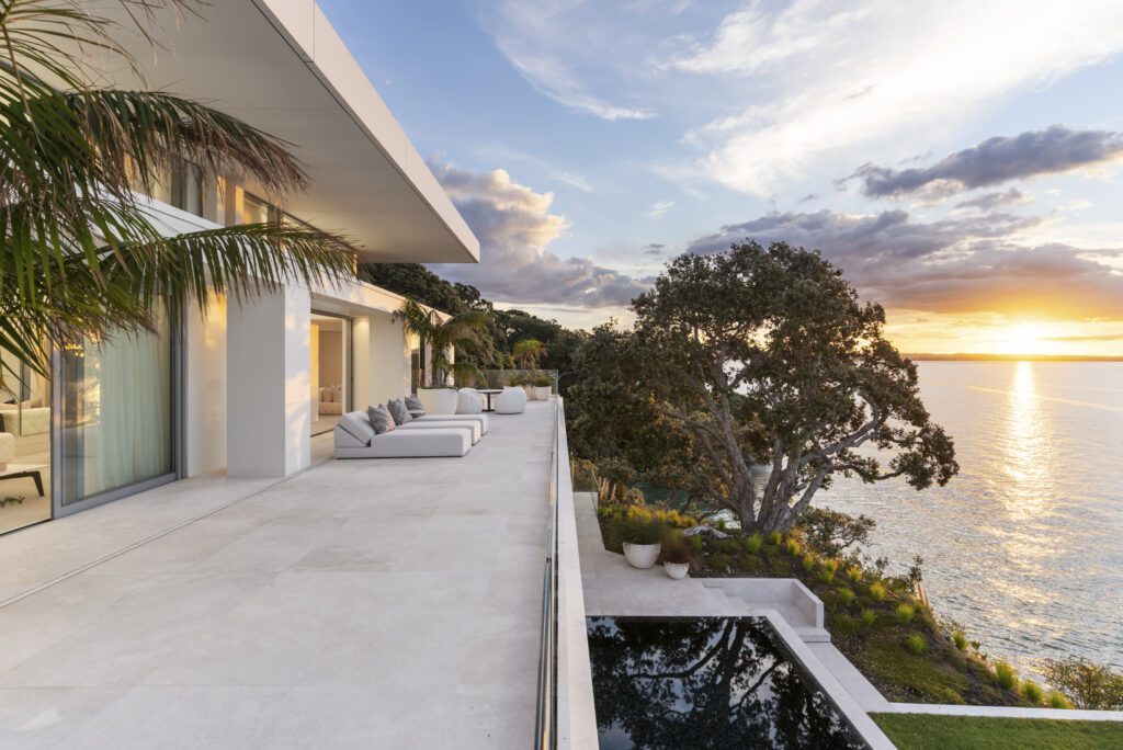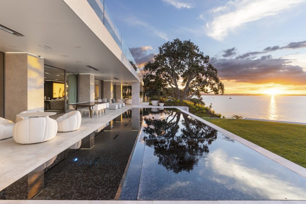 Modernist Brent Hulena designed 1,075 sqm home on over 2,810 sqm of prime Herne Bay waterfront land. The contemporary and sophisticated home has been completely reimagined and spans over three levels including underground wine cellar and bar all executed to the very highest standard. The main house offers 4 bedrooms and 9 bathrooms, the guesthouse at the rear of the property provides another 2 bedrooms and complete separation for guests. The estate is completed with a boat-shed and consented helicopter landings. A rare blend of peak architecture, scale, position and privacy.