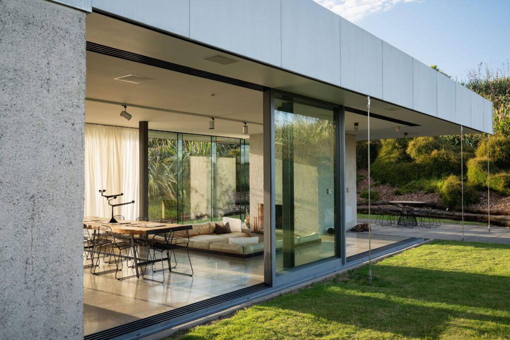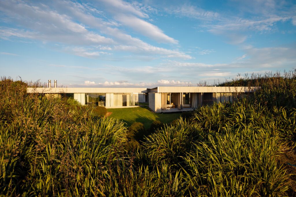 4 separate concrete pods with 5 bedrooms, 2 living spaces and pool, all opening to a central lawn and campfire.